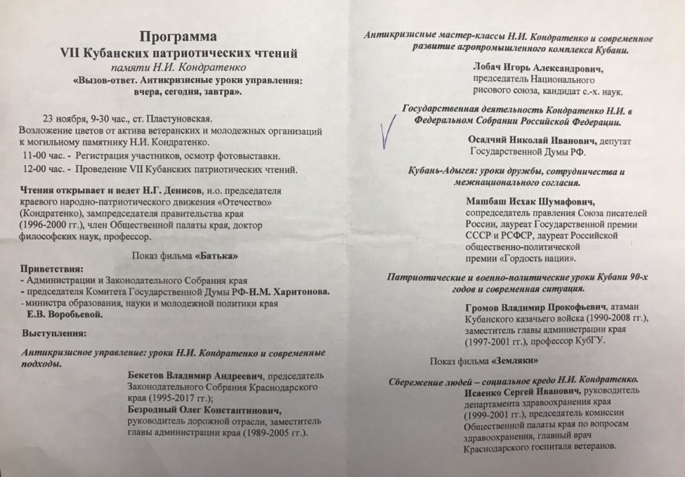 Одним из первых в ходе чтений выступил Н.И. Осадчий, первый секретарь краевого Комитета КПРФ, депутат Государственной Думы, в 1998-2002 годах – первый заместитель председателя краевого парламента, в первое десятилетие века – первый заместитель Председателя Кубанского народно-патриотического движения «Отечество (Кондратенко)». Размещаем текст его выступления.