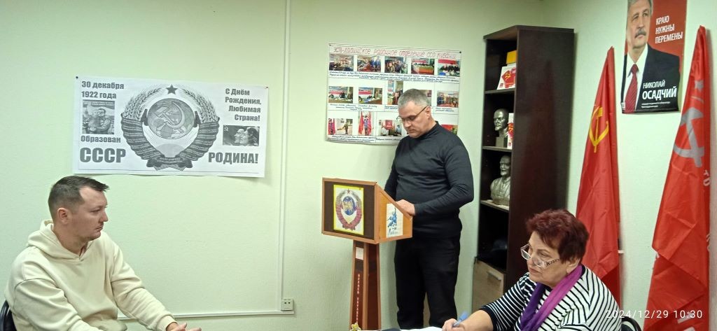 29 декабря в Усть-Лабинском местном отделении КПРФ прошёл IV пленум комитета. Открывая работу пленума, первый секретарь комитета Николай Иванович Попов поздравил коммунистов с очередной годовщиной создания Союза Советских Социалистических Республик и наступающим 2025 годом. В праздничной обстановке он вручил юбилейные открытки юбилярам.
