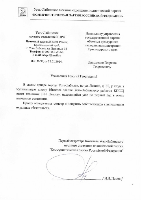 Обращение по ремонту памятника В.И. Ленину в г. Усть-Лабинск
